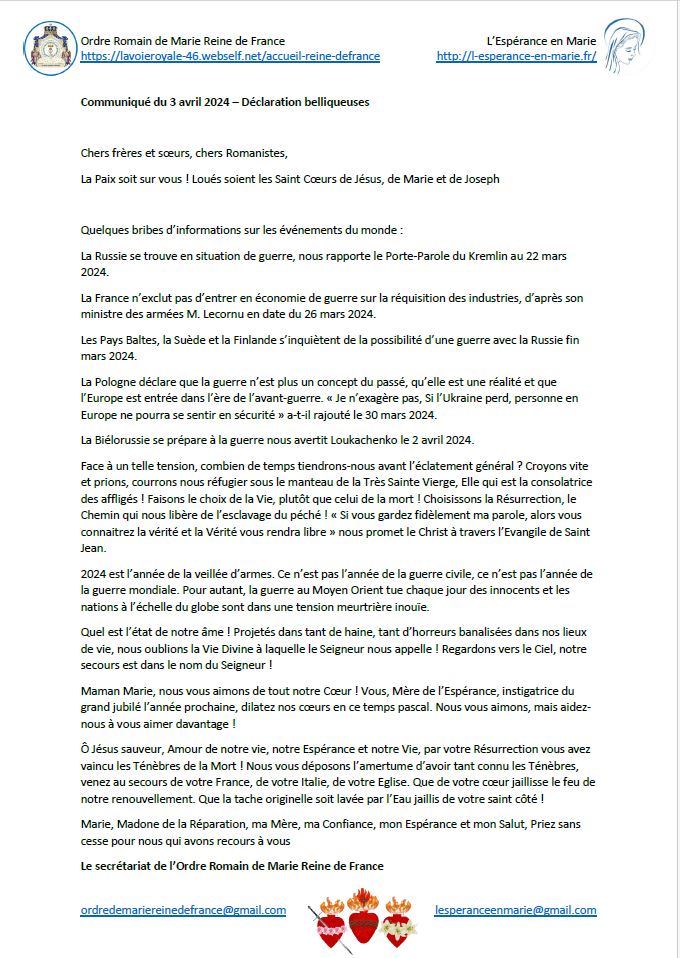 Communiqués de l’Ordre Romain de Marie Reine de France