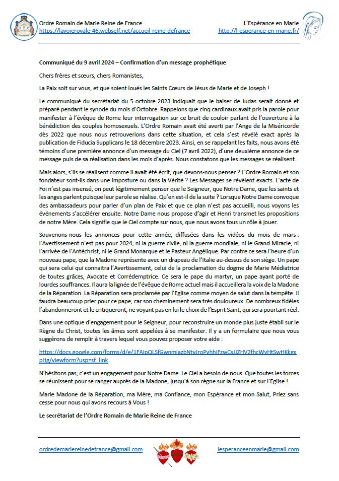 Communiqué du 9 avril 2024 – Confirmation d’un message prophétique
