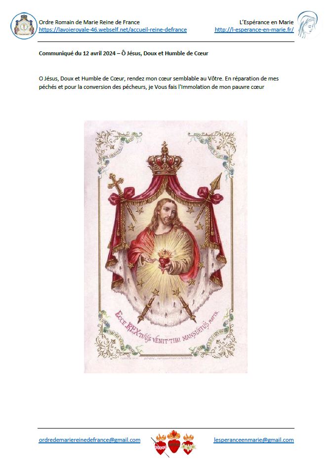 Communiqué du 12 avril 2024 – Ô Jésus, Doux et Humble de Cœur