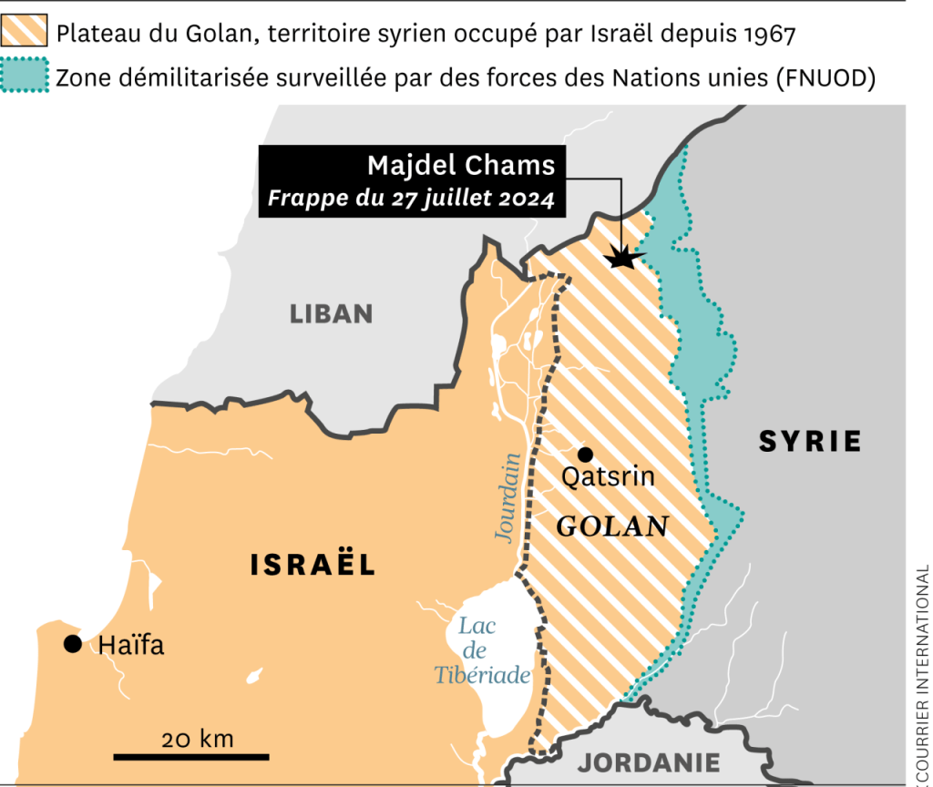 Samedi 27 juillet 2024, sur le plateau de Golan, annexée en grande partie par Israël, une attaque à la roquette a coûté la vie à 12 enfants et adolescents. Selon l’armée israélienne, la roquette a été tirée depuis le Liban par le mouvement islamiste du Hezbollah, soutenu par l’Iran. Le Hezbollah a nié être l’auteur du tir meurtrier. Ce plateau du Golan se situe à proximité de quatre pays au Moyen Orient, le Liban, l’Israël, la Jordanie et la Syrie, faisant craindre l’extension du conflit.