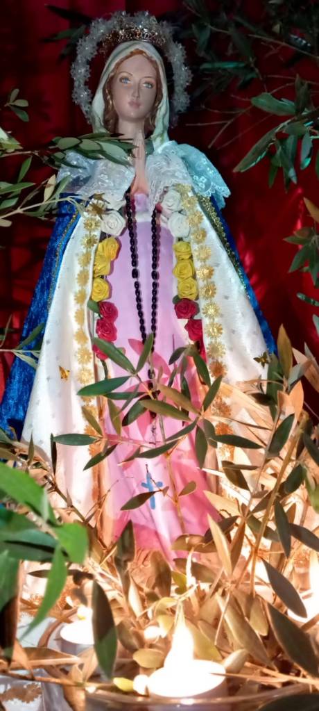 En pleine mer agitée, le jour décline sur la fragile nacelle des peuples endurcis, découragés, apeurés et lassés, sans le moindre espoir qu’il ne puisse se lever de nouveau. Á celui qui T’implore avec confiance, O Vierge Du Rosaire, Tu ne lui refuses pas Ton Secours. Toi l’Étoile de l’Espérance, descends du Ciel encore une fois. Le monde entier a besoin de Toi. La barque du genre humain menace de se fracasser sur les écueils de la guerre. Toi qui ne sait qu’Aimer, sauver, protéger, pardonner et prier : Étends sur Tes enfants Ton Manteau orné de roses, conduis-les à bon port. A deux genoux, avec empressement, nous T’invoquons, Toi L’Espérance des désespérés, au doux Nom de Marie Madone de la Réparation. À Ton Cœur Immaculé, nous nous abandonnons. À Toi nous confions nos vies, nos cœurs et nos prières de réparation. En Toi, nous espérons que Tu changes ce monde dominé par la violence, l’inquiétude, la tristesse, la haine et la guerre en un monde submergé par les flots d’Amour, d’Espérance et de Paix. Amen