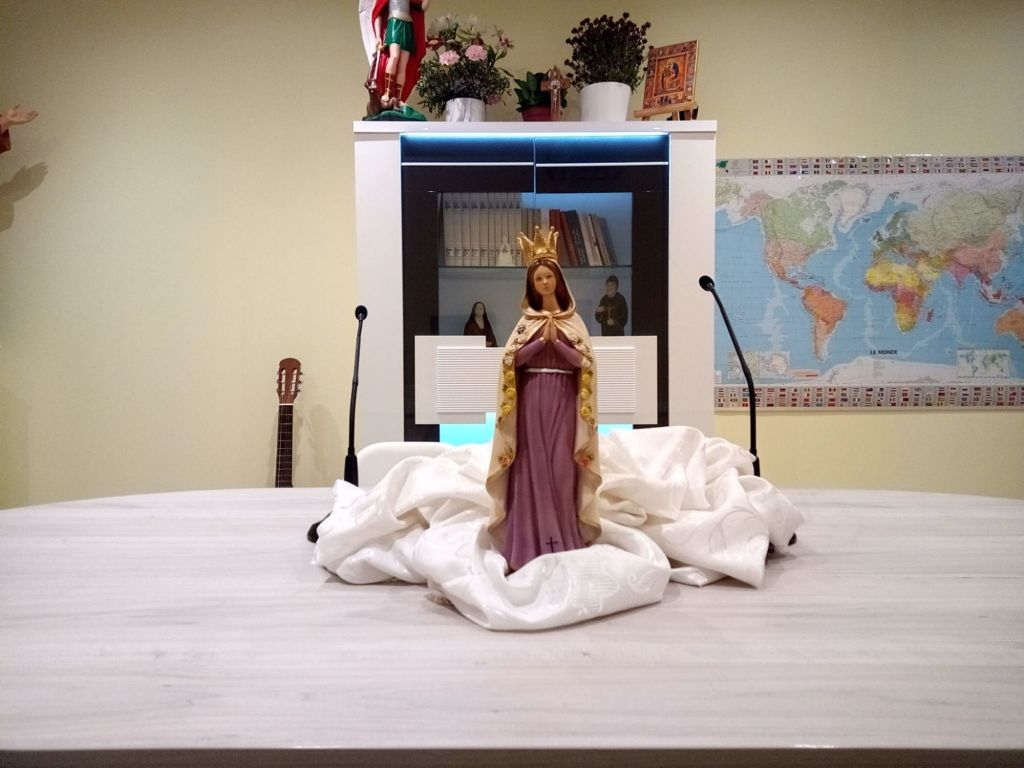 En pleine mer agitée, le jour décline sur la fragile nacelle des peuples endurcis, découragés, apeurés et lassés, sans le moindre espoir qu’il ne puisse se lever de nouveau. Á celui qui T’implore avec confiance, O Vierge Du Rosaire, Tu ne lui refuses pas Ton Secours. Toi l’Étoile de l’Espérance, descends du Ciel encore une fois. Le monde entier a besoin de Toi. La barque du genre humain menace de se fracasser sur les écueils de la guerre. Toi qui ne sait qu’Aimer, sauver, protéger, pardonner et prier : Étends sur Tes enfants Ton Manteau orné de roses, conduis-les à bon port. A deux genoux, avec empressement, nous T’invoquons, Toi L’Espérance des désespérés, au doux Nom de Marie Madone de la Réparation. À Ton Cœur Immaculé, nous nous abandonnons. À Toi nous confions nos vies, nos cœurs et nos prières de réparation. En Toi, nous espérons que Tu changes ce monde dominé par la violence, l’inquiétude, la tristesse, la haine et la guerre en un monde submergé par les flots d’Amour, d’Espérance et de Paix. Amen