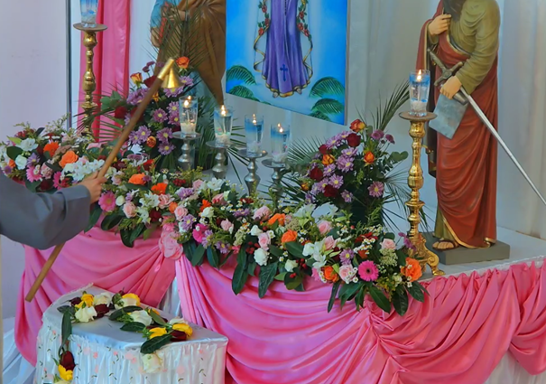 Henri : Très Sainte Vierge Marie, Mère de Dieu et notre Mère, Mère du bel Amour, Réconciliatrice des Nations, Refuge des Pécheurs, Reine des Anges et de la Paix ; nous les Romanistes, les évêques, les prêtres, les familles, les couples, les jeunes, ceux qui sont présents à la Chapelle et ceux qui sont connectés, ceux qui se trouvent à travers le monde, nous voudrions Vous offrir cette Couronne de Réparation.
