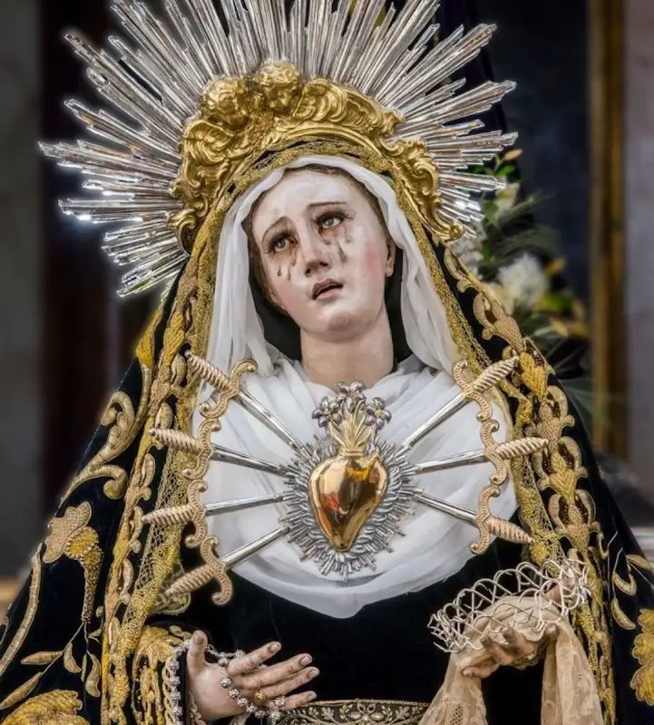 La Très Sainte Vierge ayant présenté Son Fils unique au Temple, le saint vieillard Siméon Lui dit : « Cet Enfant sera en butte à la contradiction ; et Vous-même, un glaive transpercera Votre âme ». Par ces paroles, il Lui annonce la Passion et la Mort de Jésus-Christ Notre-Seigneur.