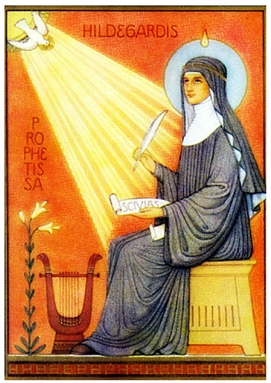 Elle était d’une noble famille germanique. Très jeune, on la confie au couvent de Disibodenberg, un monastère double, sur les bords du Rhin, où moines et moniales chantent la louange divine en des bâtiments mitoyens. Devenue abbesse, elle s’en va fonder une autre communauté à Bingen puis une à Eibingen. Elle voyage, va où on l’appelle, prêche dans les cathédrales et les couvents, correspond avec toutes les têtes couronnées, les pontifes de son temps, saint Bernard et bien d’autres.