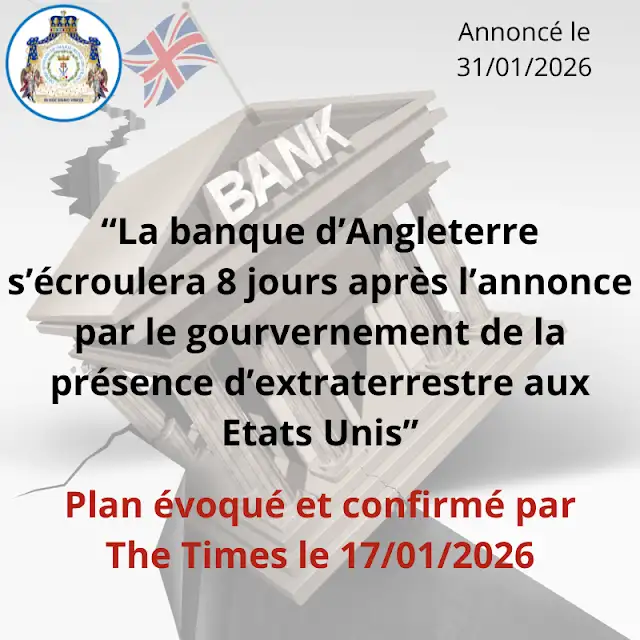 Le 30 janvier 2026, la Mère de Dieu nous faisait transmettre que la banque d’Angleterre serait en panique huit jours après l’annonce par le gouvernement actuel américain de la présence d’extraterrestres sur le territoire.