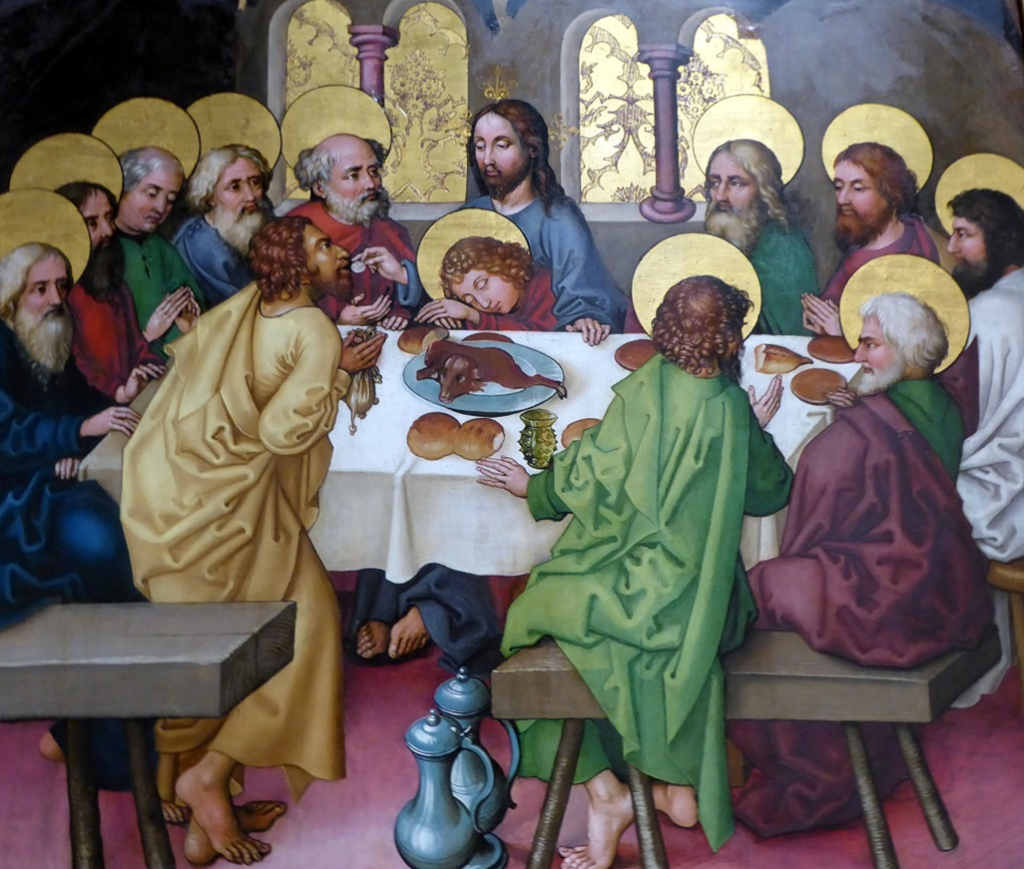 En ce Jeudi Saint, Jésus prend avec lui ses disciples et partage avec eux le repas de la Pâques. La Sainte Cène fêtée chez les juifs dans laquelle éait comémorée la traversée de la mer Rouge par le Peuple élu.