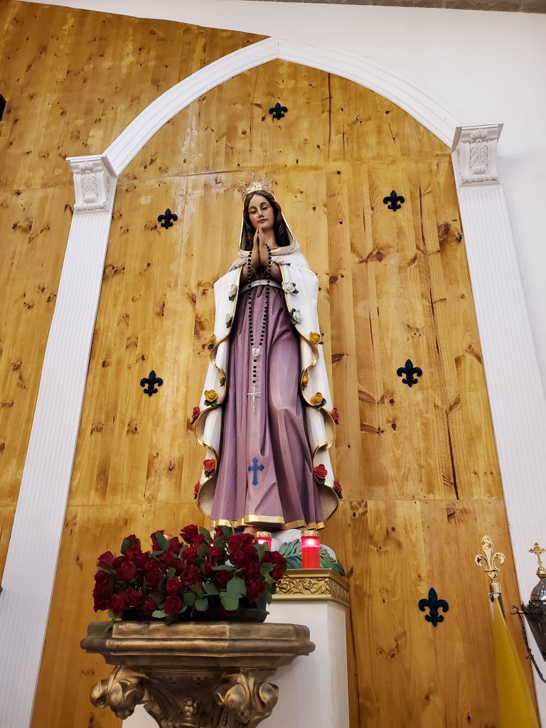 Après la prière de l’angélus ce matin, la Mère de Dieu arrive. Elle tient dans sa main droite une tige de lys nouée avec un ruban bleu et dans sa main gauche un sceptre. Autour de sa tête brille l’inscription en lettre d’or « Mater Dei ». Son chapelet habituel est noué à sa ceinture du côté gauche.