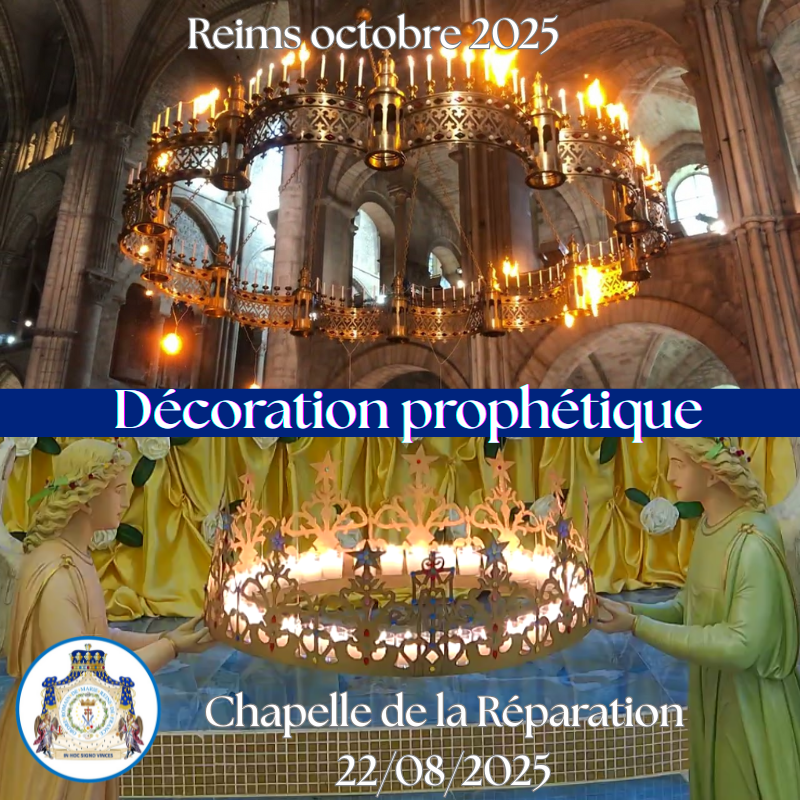 La décoration quant à elle fut une préfiguration de cette belle couronne de bougies préparée suite à la neuvaine de Saint Rémi à la cathédrale de Reims. On voit là une forte similitude avec la décoration du 22 août en la sollenité de Marie Reine Immaculée de l’univers.