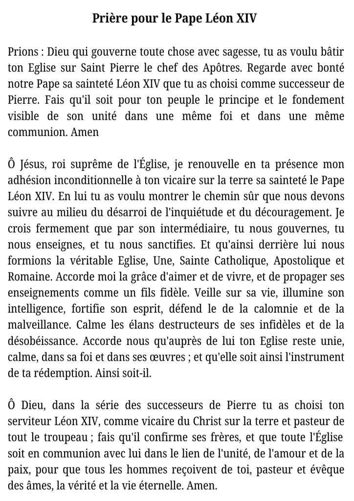 L’Ordre Romain de Marie Reine de France offre ses prières, ses pénitences et ses sacrifices pour soutenir le ministère de Sa Sainteté le Pape Léon XIV, le Souverain Pontife de l’Eglise Catholique Romaine.